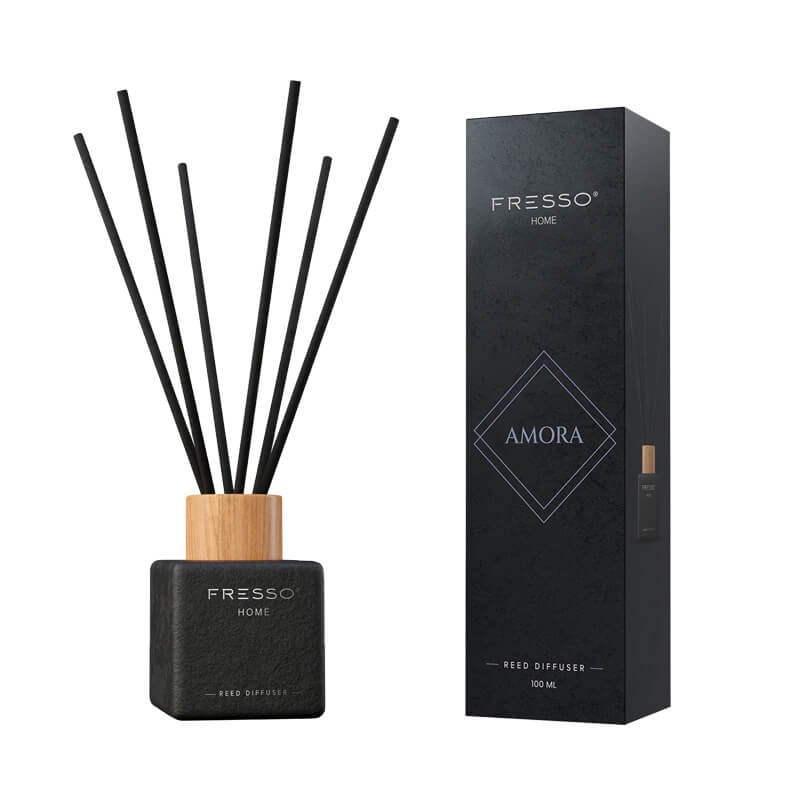 Amora to zapach łączący w sobie całkowicie odmienne główne aromaty, słodycz kwiatu pomarańczy i wanilii z pikantnością irysa i tonki. Odpowiednie połączenie całkowicie różnych aromatów sprawia, że Amora ukoi nawet najbardziej napiętą atmosferę w każdym wnętrzu. Tak jak w każdym zapachu Fresso wyróżnić można nuty głowy, serca i bazy. Do nut serca należą bergamotka, czarna porzeczka i różowy pieprz, nuty serca to jaśmin, kwiat pomarańczy oraz irys, a nuty bazy zawierają paczule, laski wanilii, fasolkę tonka i piżmo. Jak więc widać Amora to zapach o wyjątkowo bogatej kompozycji aromatów, który otuli nasz umysł swoja orientalną słodyczą.