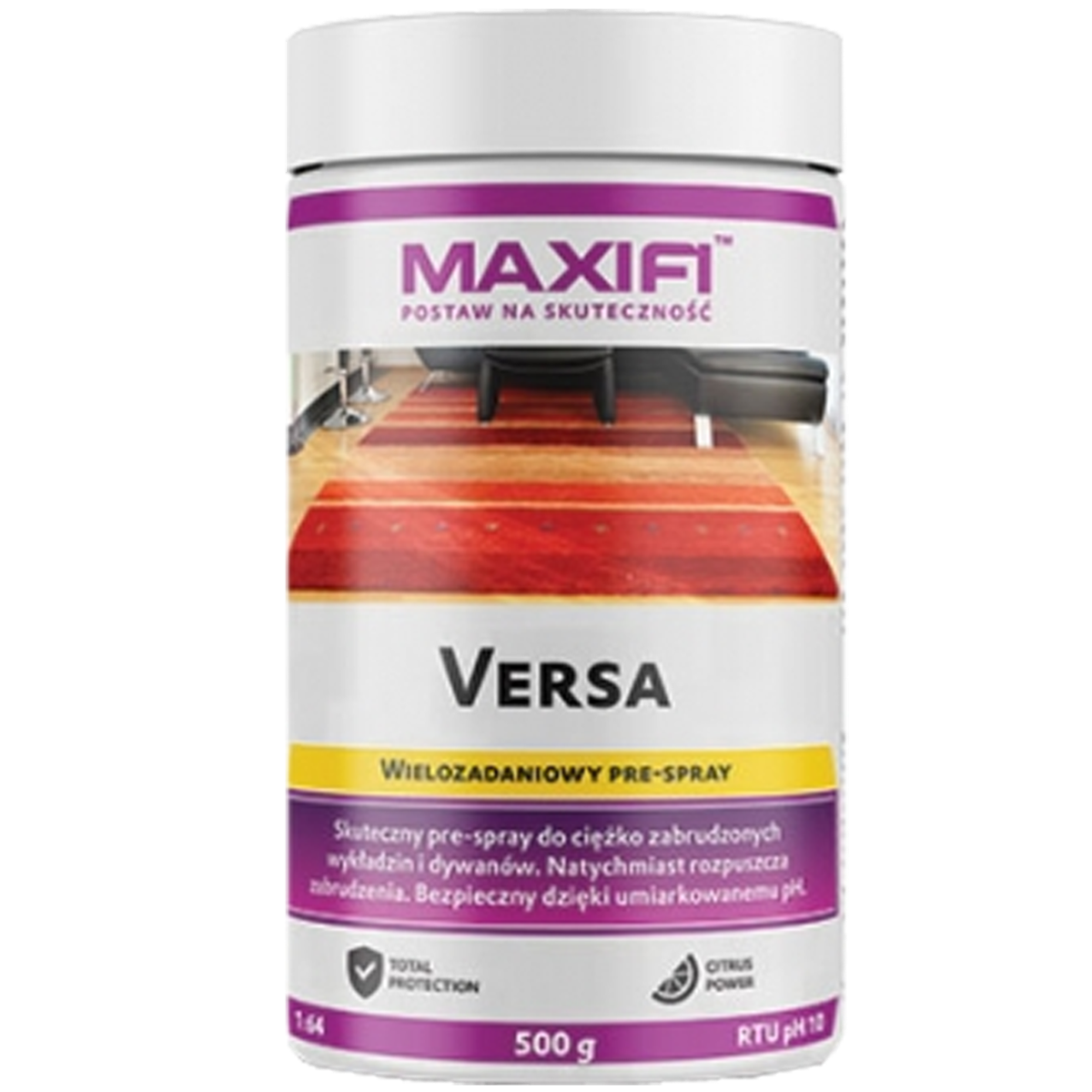 Maxifi Versa to bardzo skuteczny, skoncentrowany pre-spray w formie proszku. Doskonały do czyszczenia najmocniej zabrudzonych dywanów i wykładzin. Głęboko czyści wykładziny olefinowe zapewniając im wyśmienity wygląd. Dzięki umiarkowanemu pH jest bezpieczny dla dywanów i wykładzin, w tym wykładzin 5 generacji (impregnowanych) oraz dywanów wełnianych. Produkt został wzmocniony naturalnym rozpuszczalnikiem Citrus Power dla lepszego usuwania tłustych zabrudzeń. Formuła Total Protection chroni Twój sprzęt przed korozją oraz powstawaniem osadów.
