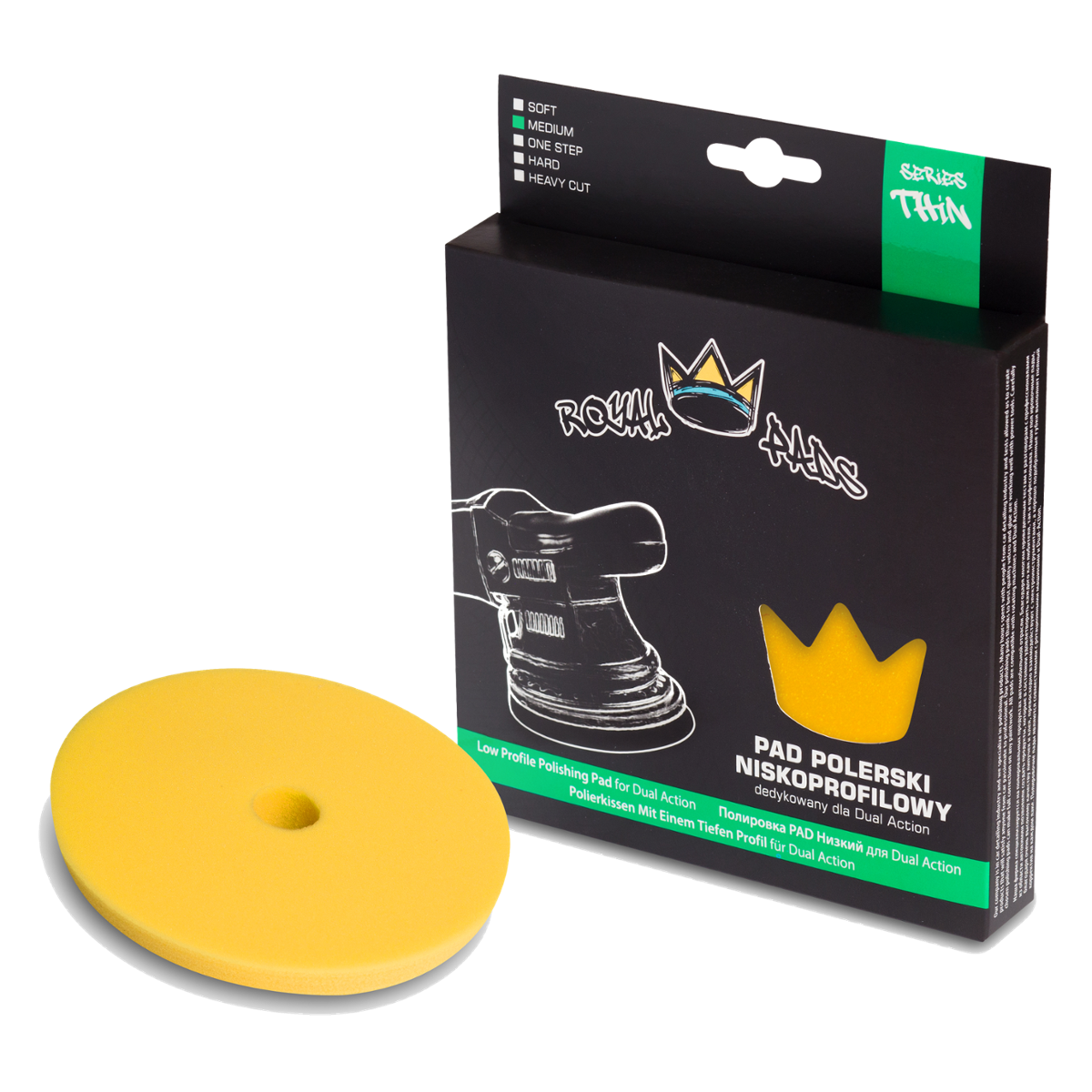 Royal Thin Medium Pad – Niskoprofilowa gąbka polerska o średniej twardości, nadająca się do wszystkich powłok lakierniczych. Dzięki dodatkowemu otworowi w centralnej czę-ści pada, ciepło wytwarzane przez śrubę mocującą „backing plate” zostaje odprowadzone, a gąbka polerska zachowuję swoje właściwości na dłuższy czas. Największą wydajność uzyskamy w połączeniu z pastami polerskimi o wysokiej oraz średniej ścieralności.